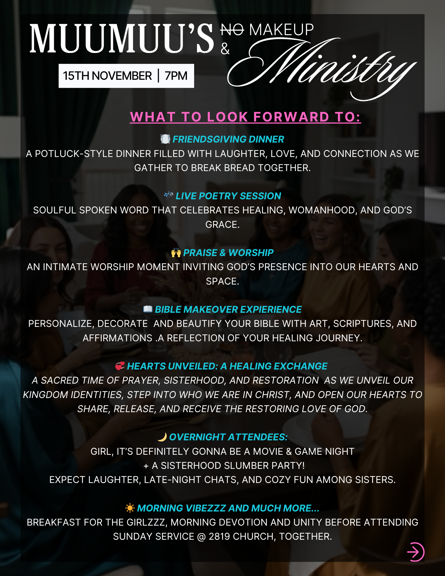 Step into an evening of faith, fellowship, and restoration designed just for sisters like you. This intimate gathering invites you to break down society’s expectations, unveil your Kingdom identity, and celebrate God’s love in community.What to Expect:Friendsgiving Fellowship Dinner (potluck-style)Live Poetry & Worship SessionsCreative Bible Customization — personalize your Bible cover with faith-based craftsHearts Unveiled: A Healing Exchange — prayer, reflection, and sisterhoodGame Night & Sisterhood Slumber Party (for overnight attendees)Morning Glory Breakfast & Sunday Service GatheringTicket Options:General Admission (7–10 PM): $20 — includes access to all evening activities and Bible customization supplies.Overnight Stay: $49.99–$74.99 — includes lodging, activities, refreshments, and a special breakfast for queens the following morning.